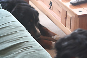 Ich verstecke mich mal mit dem Leckerchen unter dem Tisch. Da kommt Ben nicht dran.